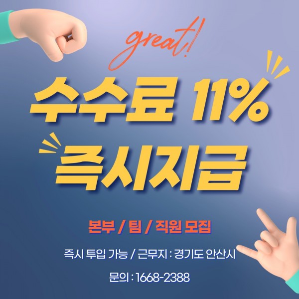 수수료 11% 현장 본부/팀/직원 모두 모집합니다. [사무실 약 90평] 더울때 시원한곳에서 근무하세요